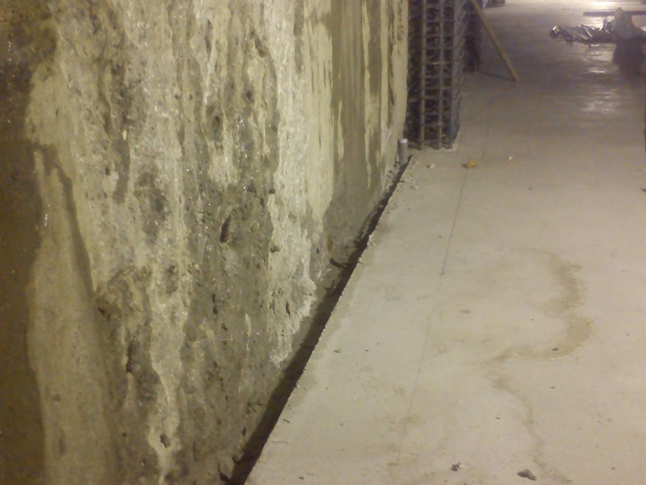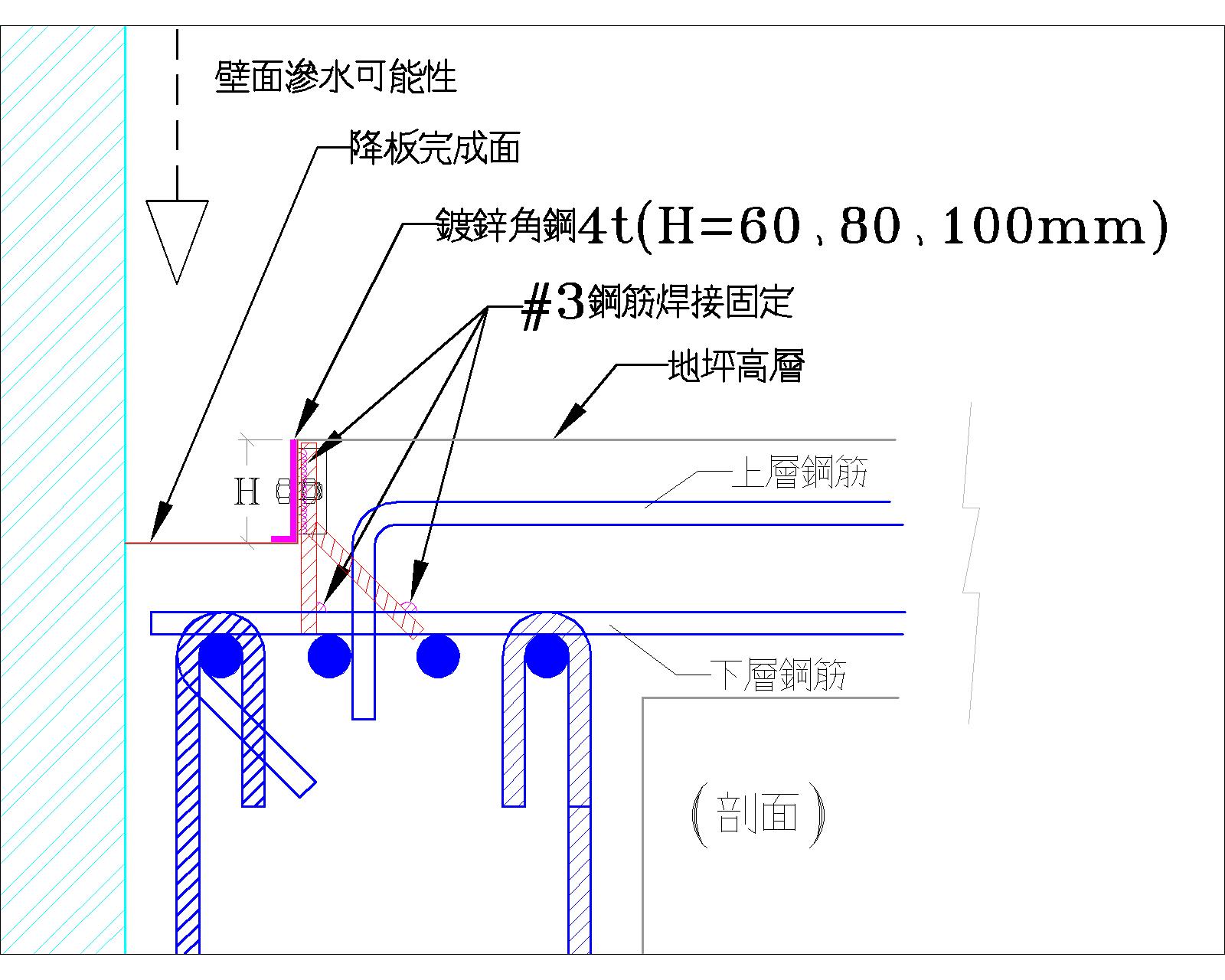 地下室周邊壁面受到大地壓力擠壓,容易導致連續壁單元接縫滲水,造成地下室周邊積水潮濕,為了有效排出地下水,於地下室壁面四周施做淺溝,利用淺溝將滲透之地下水導入集水坑排出。早期工法採用木角材做模,由於現代營造日益精進水準提升,改使用精確度高的角鐵代替木角材做模;也適用於梯廳降版,灌漿後角鐵可以拆除。